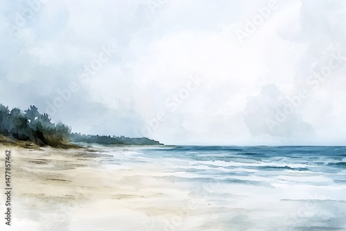 Tranquil Watercolor Seascape with Lush Greenery – Serene Coastal Horizon and Soft Cloudy Sky