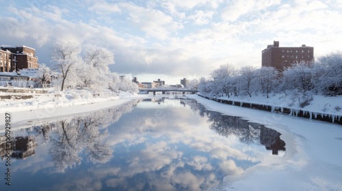 Tranquil Winter Wonderland: Snowy Cityscape with Frozen Rivers and Icicles Hanging from Rooftops under Soft Cloudy Sky