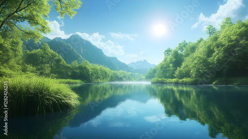 nature, calmness, river, greenery, tree, sky, harmony, environment, landscape, perception, subjective, peace, serene, interaction, undisturbed, balance, explore, narrative, lush, blue skies, emotional, scenery, water, peaceful