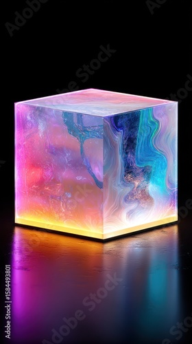 Translucent cube with swirling pastel colors atop a softly lit base