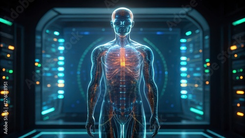 anatomy, bod, futuristic, technology, medicals, science, glowing, semitransparent, digital, laboratory, research, health care, screen, control panel, interface, datum, light, blue, orange, dark, realistic, detailed, illustration, graphic, design, abstract, concept, modern, innovation, progress, future, medicine, health, body, human