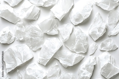 Translucent quartz crystals, clear background, mineral specimens arrangement