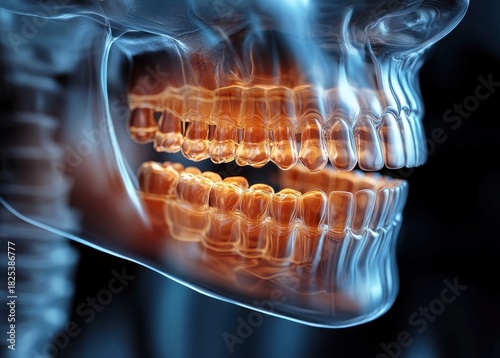 teeth, jaw, skull, dental, x-ray, radiograph, transparent, semitransparent, glowing, orange, blue, anatomy, canino, enamel, mouth, jawbone, lower jaw, bone, skeletal, human head, profile, half face, digital, futuristic, medicals, health care, dentistry, orthodontic, visualisation, science, biology, structure, clinic, neon, contrast, closeup, illuminated
