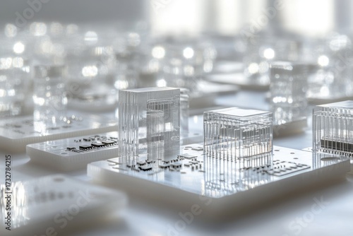 Transparent architectural models resembling futuristic city buildings sit on circuit board bases, visualizing advanced urban planning and digital technology integration.