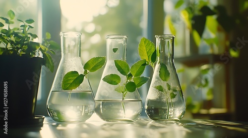 Transparent beakers filled with fresh plants images