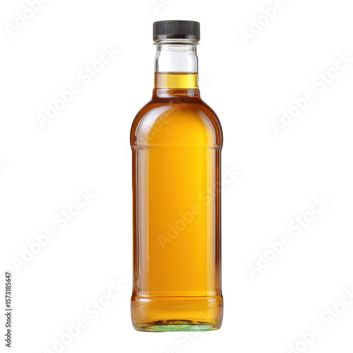 Transparent bottle filled with amber liquid against a white background, perfect for beverage and product showcases Transparent background or png