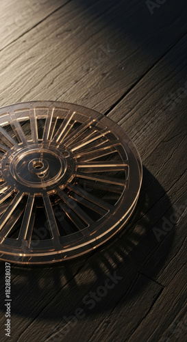 film, reel, motion picture, cinema, vintage, retro, analog, photo, disrobed, spool, plastic, transparent, semitransparent, amber, brown, dark, wood, wooden, plank, floor, texture, surface, detail, closeup, macro, light, shadow, casting, illuminated, dramatic, moody, aesthetic, artistic, conceptual, industry, media, entertainment, classic, heritage, historical, storytelling, memory, nostalgia, creative, still life, object