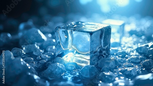 Transparent ice cubes in blues clouds and mist