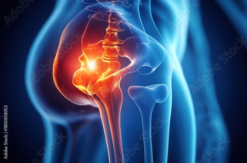 hip, pelvis, femur, inflammation, pain, joint pain, arthritis, anatomy, skeleton, bone, sacrum, orthopedics, injury, discomfort, hotspot, glowing, health care, diagnosis, physical therapy, bone structure, osteoporosis, osteoarthritis, clinical