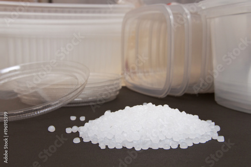 Transparent Polyethylene granules and plastic containers for the background. Plastic granules. Plastic Raw material in pellets.High Density Polyethylene (PE-HD).PE-LD. BPA FREE.