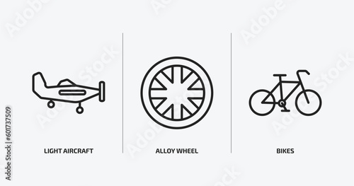 transport outline icons set. transport icons such as light aircraft, alloy wheel, bikes vector. can be used web and mobile.