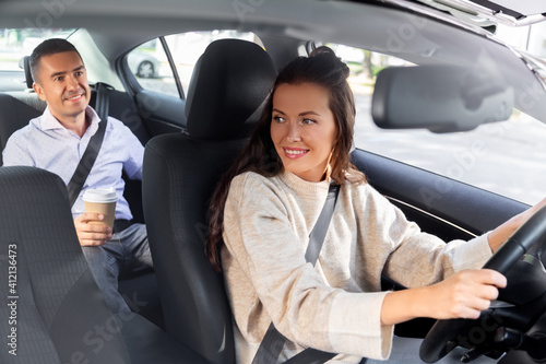 transportation, vehicle and people concept - happy smiling female driver driving car with male passenger