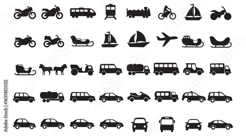 Transportation Vehicle flat icon set collection. Containing walk, bicycle, motorcycle, motorbike, train, car, truck, aeroplane, plane, bus, ship, sailboat, aircraft illustration on white background.