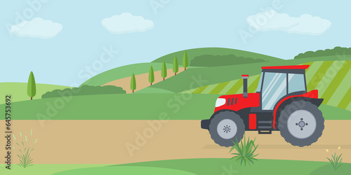 Trattore rosso su sfondo paesaggistico rurale. - illustrazioni