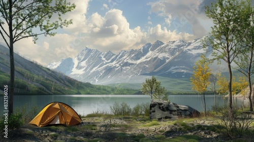 Travel and camping adventure lifestyle with outdoor tent. Springtime camping beside the lake and mountain