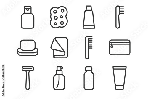 travel, bathe, kit, icon, outline, icon, set, mini, shampoo, sponge, toothpaste, toothbrush, soap, towel, hair, comb, zip, pouch, razor, water, bottle, lotion