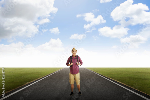asphalt, background, backpack, bag, blue, cloud, empty, grass, green, hat, highway, horizon, journey, landscape, male, man, movement, nature, road, route, rural, sky, smile, speedway, spring, transportation, travel, traveler, trip, weather