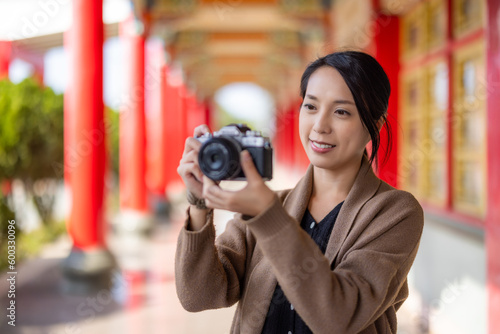 Travel woman use digital camera to take photo in Chinese temple