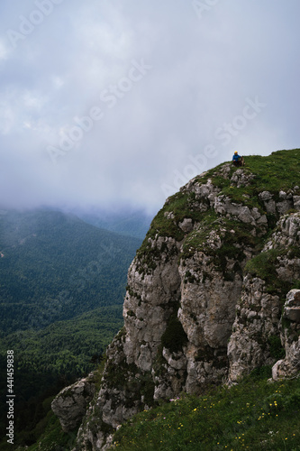 Traveler girl and her German Shepherd together on top of steep cliff against background of fog and sky before rain enjoy views and life. Female tourist is sitting on mountain and with dog.