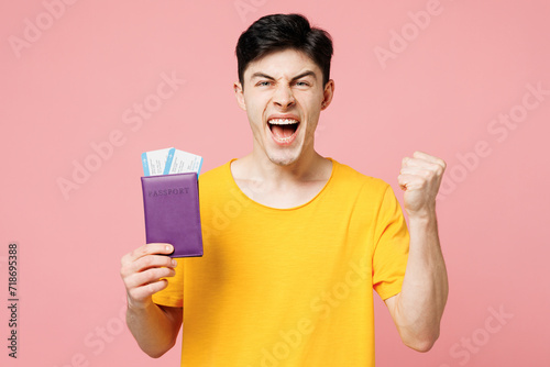 Traveler man wear yellow casual clothes hold passport ticket do winner gesture isolated on plain pink background Tourist travel abroad in free spare time rest getaway. Air flight trip journey concept