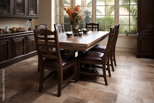 Travertine Tile Flooring Ideas: Roomy Dining Room Slab Table Inspiration