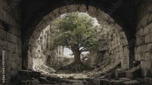 tree, nature, ruin, tunnel, stone, grey, brown, light, architecture, landscape, environment, historical, resilience, growth, life, old, passageway, peace, serenity, isolated, copy space, archaeology, ancient, environmental, broken, arch, strong, hope, surviving, stillness, texture, aged, dark, contrast
