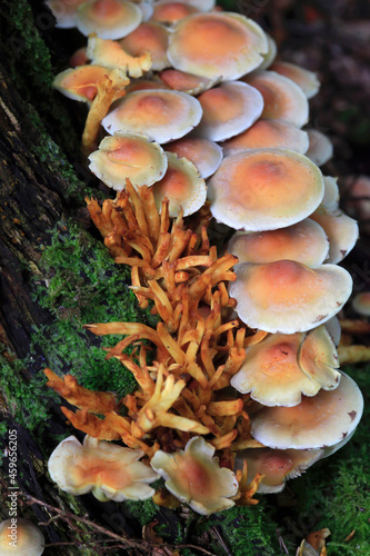 Tree trunk overgrown by brown mushrooms