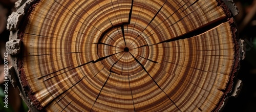 Tree trunk with detailed rings and cracks, showcasing natural textures.