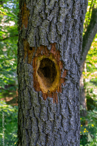 spring, sunny, sunlight, trunk, hole, made, woodpecker, smooth, edge, bark, core, visible, bush, tree, around, close, view, growth, natural, plant, fresh, garden, raw, tree, background, leaf, colours, light, health, grow, nature, vertical, forest, wood, green, outdoors, texture, environment, flora
