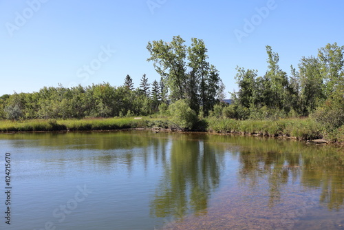 tree, reflected, calm, lake, blue, sky, water, landscape, sky, nature, river, forest, summer, tree, green, cloud, duck pond, grass, outdoors, cloud, spring, park, day, sun, season, beautiful