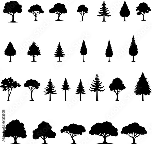 tree, silhouette, nature, forest, plant, icon, graphic, vector, black, white, outline, shape, wood, leaf, branch, trunk, ecology, environment, botanical, timberland, organic, design, element, illustration, collection, set, diverse, variety, pine, oak, palm, conifer, deciduous, evergreen, landscape, symbol, natural, garden, stylised, abstract