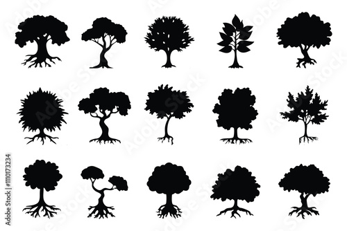Trees with minimal roots silhouette set isolated flat vector illustration on white background.