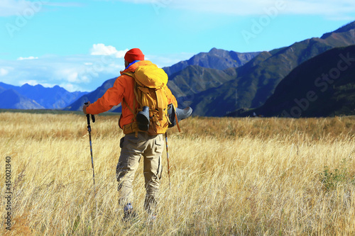trekking mountains man walking sticks travel adventure man with backpack