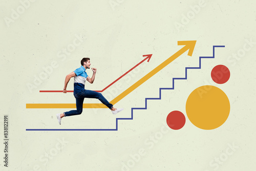 Trend artwork sketch composite photo collage of young man office manager happy run career promotion arrow show direction way up high grow