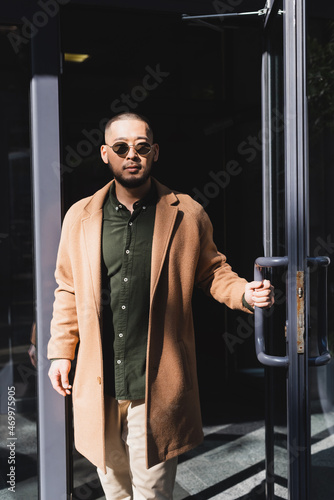 trendy asian man in beige coat and sunglasses standing near entrance of building