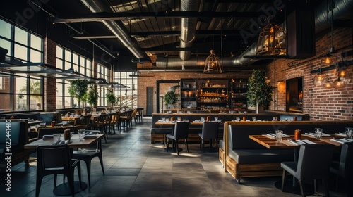 trendy, blurred, industrial, modern, interior, illustration, eatery, dining, exposed, brick, wall, metal, accent, contemporary, furniture, ambience, lively, atmosphere, interaction, client, staff, design, unique, inviting, space, socialising, background