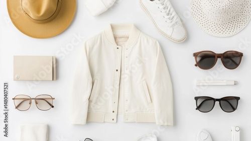 fashion, accessory, summer, outfit, sunglasses, hat, jacket, sneaker, billfold, white, trendy, style, casual attire, apparel, chic, minimalist, lifestyle, photo, bright, comfortable, new, season, design, clothing, leisure, clean, creative, aesthetic, art, nature, background, laying, arrangement, elegance, modern, simple, natural, colours, comfort, detail, texture, visual, pattern, light, fresh, elegant