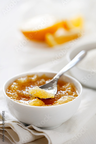 Trendy healthy homemade citrus lemon jam or confiture in a bowl on a white wooden background close-up.Delicious dessert for Breakfast. Fruit preservation.Vertical orientation