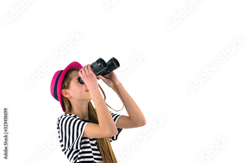 Trendy smiling slim long haired young caucasian teenage girl wearing casual clothes with binocular shows with finger in the blank space on isolated white background.,mock up banner.Summer concept.