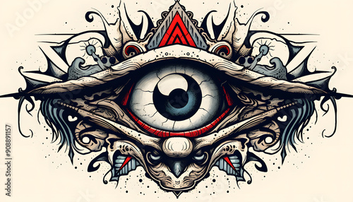 tribal, skull, dagger, eye, tattoo, lowbrow, surrealist, illustration, art, design, decorative, dark, dramatic, bold, gothic, grisly, detailed, mysterious, graphic, symbolic, creative, unique, striking, high-coloured, modern, intricate, edgy, occult, fantasy, pattern, artistic, emblem, menacing, surreal, expressive, original, vibrant
