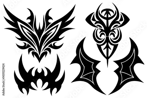 Tribal tattoo design featuring a black ornate swirl pattern, a vintage vector illustration of seamless art for body decoration