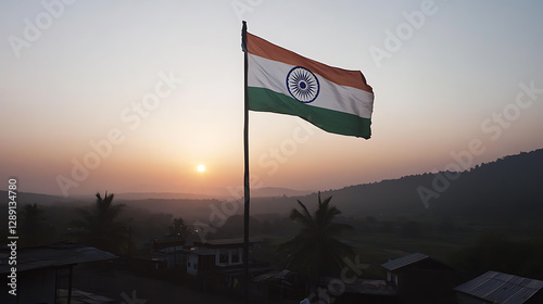 Tricolor flag against sunrise. Scenic landscape with national flag. Symbol of unity and hope, blending culture with nature's beauty. Golden light.