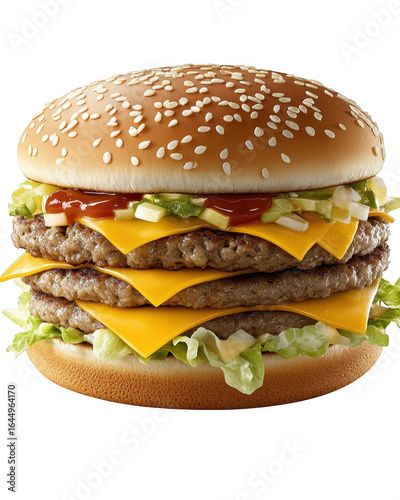 Triple cheeseburger with beef patties, cheese, lettuce, and tomato isolated on transparent background