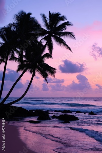 tropical, beach, dusk, palm, tree, shoreline, wave, ocean, purple, sky, sunset, rock, calmness, nature, coastal, scenic, travel, vacation, paradise, landscape, horizon, calm, evening, beauty, plant, relaxation, summer, view, atmospheric, picturesque, scenery, environment, water, sunlight, cloudy, line, adventure, exploration, serene, peaceful, coast, harmony, natural, element, silhouette, spot, frond