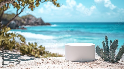 beach, tropical, ocean, sand, dais, display, summer, vacation, nature, white, product, empty, scene, desert, cactus, plant, green, blue, turquoise, calm, wave, sun, light, paradise, relaxation, travel, summer, exotic, island, holiday, photo, background, minimal, cylinder, presentation, promotion, advertising, design, shop, store, online, retail, e-business, marketing, sale, beautiful, clear