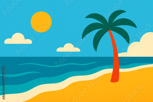 Tropical beach illustration with palm tree, ocean waves, and bright sun