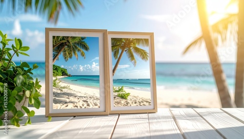 beach, tropical, island, summer, ocean, frame, picture, palm, vacation, holiday, turquoise, paradise, sand, coastline, idylli, destination, tranquil, seascape, get-away, sunny, shoreline, relaxation, journey, serenity, clear, blue, plant, wooden, table, tabletop, nobody, light, tour tourism, exotic, plant, leaf, memory, travel, potted, photo