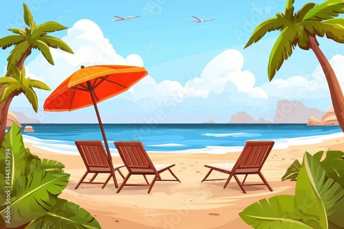 Tropical beach scene with lounge chairs and umbrella