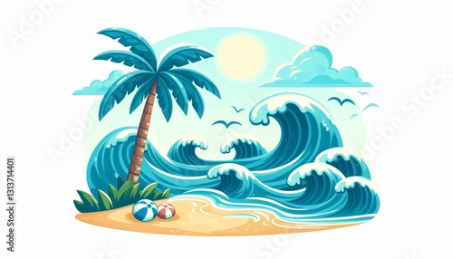 Tropical beach with palm tree, big ocean waves, sand, sun, and seagulls. Summer vacation and travel concept