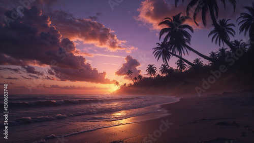 sunset, beach, tropical, palm, tree, ocean, sea, dusk, twilight, nature, landscape, travel, vacation, paradise, serene, tranquil, idylli, scenic, beautiful, summer, sun, sky, cloud, colourful, vibrant, orange, pink, purple, gold, horizon, wave, coastline, shore, sand, island, exotic, destination, relaxation, peace, calm, beauty, holiday, tour tourism, seascape, coast, evening, sunlight, dawn, dramatic